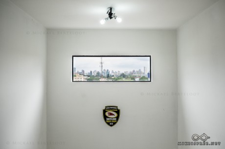 Le centre-ville de Curitiba vu à travers une fenêtre teintée.
