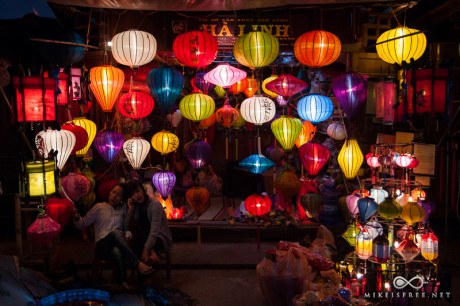 Magasin de lampions et ses vendeuses durant le marché de nuit de Hội An.