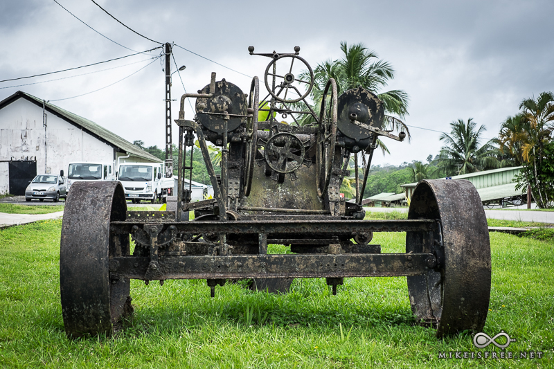 Cette niveleuse « SARM / Rhonelle » est un vestige de l’époque du bagne, lorsque Saint-Jean du Maroni hébergeait le camp de la relégation. Ce camp accueillait les bagnards récidivistes pour purger une peine… à vie. Corollaire : le cimetière est bien rempli.